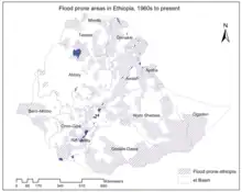 In early April 2016, National Disaster Risk Management Commission (NDRMC), Early Warning and Response Directorate warned that flood is likely to happen in flood-prone areas with high probability in the southern and south-eastern parts. Additionally, a flash flood is anticipated in the northeastern, central and eastern parts of the country. Taking into consideration the presence of the El Niño effect with anticipated above-normal rains in the belg season, the risk of flash and river flood is high. To remind that the concerned personnel should undertake appropriate measures ahead of time in order to minimize the effect of flood hazards in the areas.[25]