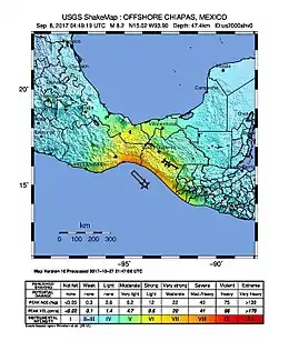 The 2017 Chiapas earthquake struck at 23:49 CDT on 7 September (local time; 04:49 on the 8th UTC) in the Gulf of Tehuantepec off the southern coast of Mexico near the state of Chiapas, approximately 87 kilometres (54 mi) southwest of Pijijiapan (alternately, 101 kilometres (63 mi) south-southwest of Tres Picos),[6] with a Mercalli intensity of IX (Violent).[7] The moment magnitude was estimated to be Mw8.2.[1]