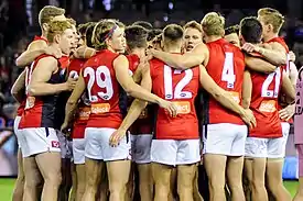 ![]() Melbourne huddle during the round 13 match against the Western Bulldogs | |||