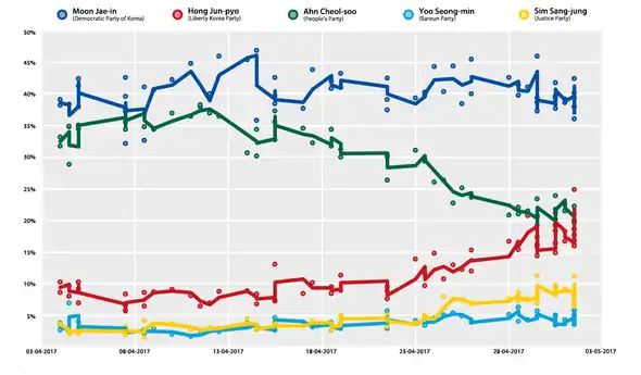 Opinion polling before April consistently placed the Democratic Party's candidate, Moon Jae-in, runner-up in the 2012 election, as the front-runner. Second place in the opinion polls was initially held by former UN Secretary-General Ban Ki-moon, who declined to run in February, followed by Ahn Hee-jung, whilst he lost the Democratic primaries to Moon. Support for People Party founder Ahn Cheol-soo then surged, threatening Moon's lead in the polls throughout early April, before descending to approximately equal that of Liberty Korea Party's candidate, Hong Jun-pyo, in final polls.