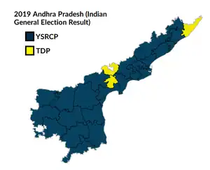 General Elections were held in Andhra Pradesh on 11 April 2019 to elect representatives for the 17th Lok Sabha.[1][2][3][4] The YSRCP swept the elections, winning 22 of the 25 Lok Sabha seats in the state. TDP was reduced to just 3 seats, and national parties like BJP and INC were decimated, not winning any seat.
