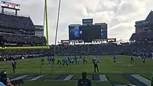 New England took the opening kickoff and drove 57 yards in 8 plays, the longest a 21-yard completion from Tom Brady to tight end Benjamin Watson. Nick Folk finished the drive with a 36-yard field goal to put the Patriots up 3–0.[17] Tennessee struck back, with Henry carrying the ball 6 times for 44 yards on a 75-yard drive,[17] that gave the team a 7–3 lead with Ryan Tannehill's 12-yard touchdown pass to Anthony Firkser, the first playoff touchdown scored by a Harvard University graduate.[18] New England then moved the ball 75 yards in 10 plays, featuring a 25-yard run by Sony Michel.[17] Receiver Julian Edelman finished the drive with a 5-yard touchdown run – his first such touchdown[17] – on an end around play on the first play of the second quarter, giving the Patriots a 10–7 lead. Later on, Patriots receiver Mohamed Sanu returned a punt 23 yards to the Titans' 47-yard line, and the team drove on to a first and goal on the 1-yard line.[18] The Titans held out on the goal line; linebacker Rashaan Evans dropped Michel for a 1-yard loss on first down, Rex Burkhead was tackled on the 1-yard line by Evans and DaQuan Jones on second down and Evans tackled Michel for a 2-yard loss on third down. The Patriots took a 13–7 lead on Folk's 21-yard field goal with 2:16 left in the half. Henry took off for a 29-yard gain on the first play of the team's ensuing drive, before picking up 23 more yards with his next three carries after an incompletion. Henry then ran a screen pass 22 yards to the Patriots' 1-yard line, ultimately converting a 1-yard touchdown run to give the Titans a 14–13 halftime lead.