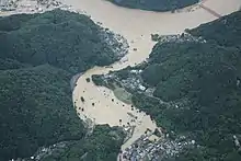 The 2020 Kyushu floods were a series of floods in July 2020 brought on when record-breaking heavy rain hit the prefectures of Kumamoto and Kagoshima, on the southern Japanese island of Kyushu, on 4 July 2020 in the middle of the East Asian rainy season. The event is officially referred to as Reiwa ni-nen shichi-gatsu gōu (令和2年7月豪雨, "Heavy rain of July, Reiwa 2") by the Japan Meteorological Agency.[1] As a result of flooding and landslides, 77 people were confirmed dead (includes 1 death due to cardiopulmonary arrest) and approximately seven are missing.[2] Fourteen of the victims were residents of an old age home in Kuma, Kumamoto that was flooded. Approximately 15,335 buildings were destroyed, damaged or flooded.[3]