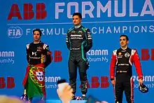 Mitch Evans (center) scored his second Formula E victory, António Félix da Costa (left) finished second and Sébastien Buemi (right) scored his first podium finish of the season.
