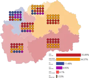 - ↑ Includes Citizen Option for Macedonia (GROM), the Movement for Turkish National Union, the Democratic Party of Serbs in Macedonia, the Democratic Party of the Roma, the Democratic Forces of the Roma, Macedonian Action (MAAK), the New Liberal Party, the Party of the Vlachs of Macedonia (PVM), the Party of United Democrats of Macedonia, the United Party of the Roma in Macedonia, the Workers’ Agricultural Party of Macedonia, the Socialist Party of Macedonia, the Serbian Progressive Party, the Party of Democratic Action of Macedonia, the Union of Tito’s Left Forces, Roma Integration Party, and Democratic Bosniak Party, as well as the independent candidates Adnan Arsovski and Adnan Kahil