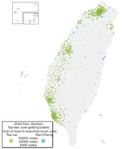 The elections had a turnout of 74.9%, the highest among nationwide elections since 2008. Tsai won a record 8.17 million votes, representing 57.1% of the popular vote, the highest vote share won by a DPP candidate in presidential elections.[3] The DPP received a higher share of the vote in major metropolitan areas, reversing the KMT's fortunes in Kaohsiung and environs, while the Kuomintang retained strength in limited eastern regions and off-island constituencies. Tsai and Lai were inaugurated on 20 May 2020.