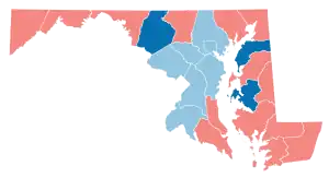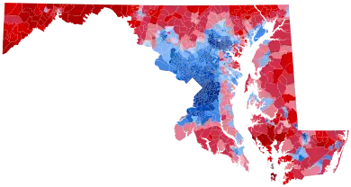 With the exception of racially polarized Somerset County, every county in the state swung to Biden from Hillary Clinton's performance in 2016; many swung Democratic by double digits.[29] The Republican presidential vote share has now declined for four elections in a row in the Old Line State, the longest such current run for the party in any state. It was also one of five states in the nation in which Biden's victory margin was larger than one million raw votes: the others being California, New York, Massachusetts and Illinois.