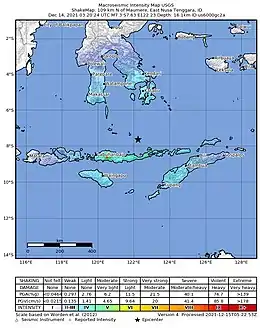 - 1 2 3 Wallansha, Robby (15 December 2021). "Ulasan Guncangan Tanah Akibat Gempa Bumi Di Laut Flores Nusa Tenggara Timur 14 Desember 2021" [Review of Earthquake Due to Earthquake in the Flores Sea, East Nusa Tenggara 14 December 2021]. bmkg.go.id. Meteorology, Climatology, and Geophysical Agency. Retrieved 30 April 2022.