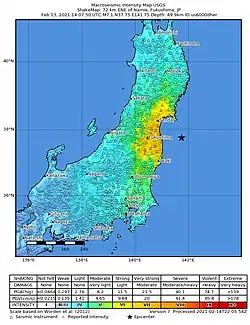 According to the JMA, the earthquake had a maximum intensity of Shindo 6 Upper.[12] These intensities were recorded in Fukushima and Miyagi prefectures. However, the Earth Science and Disaster Prevention Research Institute suggested the earthquake may have also caused Shindo 7 shaking at Yamamoto, Miyagi.[3] At the same location, the maximum peak acceleration caused by the earthquake was recorded at 1,432 gals, far exceeding the 980 gals and 1,362 gals recorded in Mashiki, Kumamoto during the 2016 Kumamoto earthquakes which were assigned Shindo 7.[4] This event which occurred near the deeper portion of the subduction interface generated short-period seismic energy which caused severe shaking at the coast.[29]