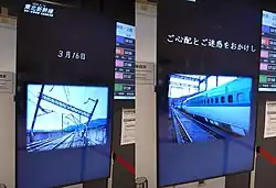 - ↑ "東北新幹線下り「やまびこ223号」脱線確認 乗客96人けがなし" [Southbound Tohoku Shinkansen "Yamabiko 223" confirmed derailed; 96 passengers uninjured]. NHK (in Japanese). 17 March 2022. Archived from the original on 16 March 2022. Retrieved 16 March 2022.
