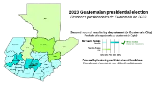 General elections were held in Guatemala on 25 June 2023 to elect the president and vice president, all 160 seats in Congress, all 20 members of the Central American Parliament, and mayors and councils for all the country's 340 municipalities. Incumbent president Alejandro Giammattei was constitutionally prohibited from running for a second four-year term.[1] However, as no presidential candidate obtained over 50 percent of the vote in the first round on 25 June 2023, a second round was held between the top two finishers on 20 August 2023: Congressman Bernardo Arévalo (the son of former president Juan José Arévalo) of the Movimiento Semilla and Sandra Torres, a former first lady representing the National Unity of Hope (UNE) party.[2] Arévalo defeated Torres in the second round with nearly 61 percent of the vote in what was seen as a landslide.[3] The ruling Vamos party won the largest number of seats in Congress.[4]