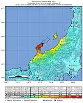The Japan Meteorological Agency said it recorded a maximum seismic intensity of 7 (Shindo 7), the highest level on its seismic intensity scale,[31] the first time that an earthquake of that intensity had been observed in the country since 2018.[32][33] The maximum intensity was reported in Shika, Ishikawa Prefecture. Intensity 6+ was recorded in Nanao, Wajima, Suzu and Anamizu. Intensity 6– was recorded in Nagaoka in Niigata Prefecture and in Ishikawa's Nakanoto and Noto.[33] The earthquake was also felt by residents in Tokyo and across the Kanto Region[7] and as far as Aomori Prefecture in the northern tip of Honshu to Kyushu in the south of the country.[32] A peak ground acceleration of 2,826 gal was observed in Shika, which was close to that recorded during the 2011 Tohoku earthquake which measured 2,934 gal.[34] Due to the ground beneath Wajima and Anamizu comprising soft sediments, ground motions were amplified.[35]