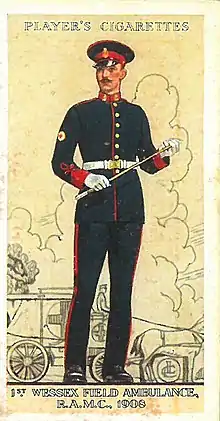 John Player & Sons Tobacco Company cigarette card showing a soldier of the 1st Wessex Field Ambulance in full dress in 1908. The 1st Wessex Field Ambulance was one of the main predecessors to the hospital and served with distinction during the First World War.