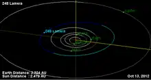 Lameia (minor planet designation: 248 Lameia) is a typical main belt asteroid. It was discovered by Austrian astronomer Johann Palisa on 5 June 1885 in Vienna and was named after the Lamia, a lover of Zeus in Ancient Greek mythology. 248 Lameia is orbiting the Sun with a period of 3.88 years and a low eccentricity (ovalness) of 0.067.[2] The semimajor axis of 2.47 AU is slightly inward from the 3:1 Kirkwood Gap.[4] Its orbital plane is inclined by 4° to the plane of the ecliptic.[2]