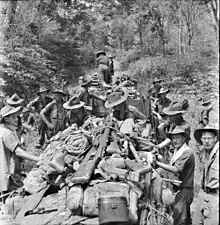 A six month period of home service in Australia followed, during which intensive training was carried out around Ravenshoe, Queensland, on the Atherton Tableands.[12] In September 1943, the brigade was committed to the capture of Lae,[11] as the 7th Division was flown into Nadzab to begin the advance from there, while the 9th Division carried out another advance on Lae from the coast. While emplaning in Port Moresby, the 2/33rd Battalion suffered heavy losses when a Liberator bomber crashed on take off amongst trucks carrying members of the battalion. Nevertheless, the brigade arrived in Nadzab and on 9 September began their advance through the Markham Valley and after clashes around Jensen's and Heath's Plantations, the brigade entered Lae on 16 September.[13] Following the capture of Lae, the brigade was flown to Kaiapit and the took part in the advance through the Finisterre Range, culminating in the Battle of Shaggy Ridge.[14][15] After being relieved in early 1944 by the 15th Brigade, the 25th was withdrawn to Port Moresby in January 1944 and returned to Australia the following month.[16]