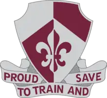 Description/Blazon: A Silver color metal and enamel device 1+1⁄8 inches (2.9 cm) in width overall consisting of a shield blazoned: Per pale and per chevron Argent and Sanguine, a fleur-de-lis counterchanged. Attached below the shield, a tripartite Silver scroll inscribed "PROUD TO TRAIN AND SAVE" in Maroon letters.[10]