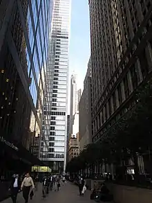 Cedar Street was closed in the late 1950s to make way for 28 Liberty Street's construction.[7][8] In exchange for acquiring the block of Cedar Street, Chase agreed to cede 8 to 15 feet (2.4 to 4.6 m) on each side of the lot for street-widening, paid the city $100,000, and took responsibility for utilities under the newly closed portion of Cedar Street.[13][12] The city had rarely closed streets for private commercial development, except when there was "substantial" benefit to the public, such as with Grand Central Depot (later Grand Central Terminal) and the original Pennsylvania Station.[7] Chemical Bank, which purchased the adjacent 20 Pine Street, agreed to carve out an arcade on that building along the southern facade of the ground level in order to allow the widening of the Pine Street sidewalk.[13]
