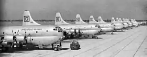 The first Boeing KC-97E Stratofreighter air refueling aircraft assigned to Strategic Air Command was delivered to the wing's 306th Air Refueling Squadron at MacDill AFB on 14 July 1951 and inflight refueling operations started in May 1952, with KC-97s refueling B-47s on operational training missions leading toward combat ready status. B-47Bs from the 306th Bomb Wing began a 90-day rotational training mission to RAF Fairford, Gloucestershire, in June 1953, marking the first overseas deployment of the B-47.[7] Further overseas deployments by the entire wing followed in January 1955, October 1956, and October 1957 to Ben Guerir AB, Morocco. For its role in advancing jet bombardment tactics, the wing was awarded its first Air Force Outstanding Unit Award.[1]