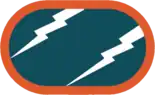 The 313th's flash is a teal blue shield-shaped embroidered item with a semi-circular base. Around the edge of the flash is a 1⁄8 inch (0.32 cm) orange border, two white lightning bolts bendwise sinister, one issuing from the top of the flash and one issuing from the lower right side; the overall dimensions are 2+1⁄4 inches (5.7 cm) in height by 1+7⁄8 inches (4.8 cm) in width. The airborne background trimming is a teal blue oval-shaped embroidered item edged with a 1⁄8 inch (0.32 cm) orange border two white lightning bolts bendwise sinister, one issuing from the top of the item and one issuing from the right side. The overall dimensions are 1+3⁄8 inches (3.5 cm) in height by 2+1⁄4 inches (5.7 cm) width. [31]