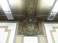 The fare control areas are at platform level, and there is no crossover or crossunder between the platforms.[2]: 4 The walls along the platforms near the fare control areas consist of a brick wainscoting on the lowest part of the wall, with bronze air vents along the wainscoting, and white glass tiles above. The platform walls are divided at 15-foot (4.6 m) intervals by buff and green mosaic tile pilasters, or vertical bands. In the original portion of the station, each pilaster is topped by green faience plaques depicting eagles, an allusion to the former 71st Regiment Armory at Park Avenue and 33rd Street; the eagles hold blue and white shields containing the number "33". A cornice with yellow and brown vine and fretwork patterns runs atop these walls.[2]: 4–5 [6]: 8 The platform extensions contain tiles with the number "33" atop the pilasters. Mosaic plaques with the words "33rd St." are also spaced at various intervals on the walls.[2]: 5 The mosaic tiles at all original IRT stations were manufactured by the American Encaustic Tile Company, which subcontracted the installations at each station.[46]: 31 The decorative work was performed by tile contractor John H. Parry and faience contractor Grueby Faience Company.[46]: 35 The ceilings of the northern fare control areas contain plaster molding.[2]: 4–5 [46]: 10