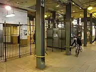 The 1997 artwork at this station is Lariat Seat Loops by James Garvey. These are composed of fourteen bronze loops surrounding the I-beam columns near the northern fare control areas, which are designed as handholds or seat rests.[49][50][51] According to Garvey, "the thick bronze bar ... resembles the lasso demonstration in a Will Rogers film clip".[50] Garvey subsequently designed Lariat Tapers, a similar artwork at the Wall Street station, in 2011.[52]