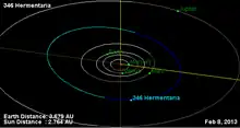Hermentaria (minor planet designation: 346 Hermentaria) is a very large main-belt asteroid. It was discovered by French astronomer Auguste Charlois on 25 November 1892, in Nice. It is probably named for the town of Herment in the region of Auvergne, France.[5] The asteroid is orbiting the Sun with a period of 4.68 years and an eccentricity (ovalness) of 0.10. The orbital plane is inclined by 8.7° to the plane of the ecliptic.