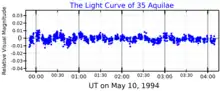 In 1994 it was discovered that 35 Aquilae is a variable star with a pulsation period of just 30 minutes.[11] It was determined to be a Delta Scuti variable, which is a type of star found on the instability strip that undergoes short period pulsations.[4] Observation with the Spitzer Space Telescope shows that 35 Aquilae is radiating an excess level of infrared radiation for a star of its type. This excess may be explained by the heating of nearby interstellar dust belonging to a diffuse cloud of material that the star is passing through. This interaction may also explain the Lambda Boötis categorization for this star.[6]