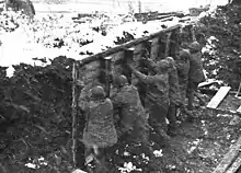 The 395th hit the attacking Germans with such terrific small arms and machine gun fire that the Germans couldn't even remove their dead and wounded in their rapid retreat.[16] The accurate fire from the 12 3-inch guns of A Company, 612th Tank Destroyer Battalion, was instrumental in keeping German tanks from advancing. During the first day of the Battle of the Bulge, the 3rd Battalion took 19 prisoners and killed an estimated 200 Germans. Accurate estimates of German wounded were not possible, but about 20 percent of the 326th Volksgrenadier Division were lost. The 395th's casualties were extremely light: four dead, seven wounded, and four men missing.[17]: 51