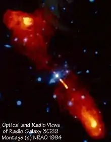 3C 219 is a Seyfert galaxy[1] with a quasar-like appearance located in the constellation Ursa Major. This galaxy's radio jets are not detectable between the core and the outer radio lobes.[3]