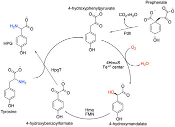 4-Hydroxymandelate is subsequently oxidized by hydroxymandelate oxidase (Hmo) to 4-hydroxylbenzoylformate, using FMN as a cofactor.[3] Finally, 4-hydroxyphenylglycine transaminase (HpgT) transfers an ammonia moiety from a donor to 4-hydroxylbenzoylformate to form HPG. Several different molecules can serve as the nitrogen donor for the transamination, however, Hubbard et al suspect L-tyrosine to serve as the most efficient donor.[4] By doing so, the following cycle is constructed: