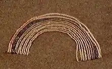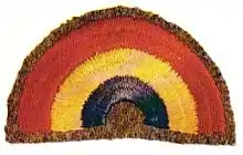 The 42nd Division adopted a shoulder patch and distinctive unit insignia acknowledging the nickname.[5][6] The original version of the patch symbolized a half arc rainbow and contained thin bands in multiple colors.[7][8][9] During the latter part of World War I and post war occupation duty in Germany, the patch was changed to a quarter arc.[10] According to the division's official history, Colonel William N. Hughes Jr., who had succeeded MacArthur as chief of staff, was credited with modifying the design to a quarter arc in an attempt to standardize it.[10] Division lore includes the story that division commander Charles T. Menoher approved the patch after observing a rainbow shortly before a battle, deciding this was a favorable omen.[10] According to World War I veterans of the 42nd Division, soldiers removed half the original symbol to memorialize the half of the division's soldiers who had been killed or wounded during the war.[7][11] They also reduced the number of colors to just red, gold and blue bordered in green, to standardize the design and make the patch easier to reproduce.[9][10]