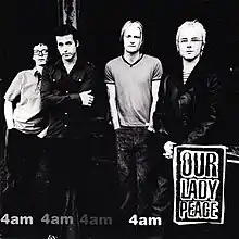 "4am" is a song by Canadian alternative rock band Our Lady Peace. It was released in December 1997 as the fourth single from their second album Clumsy.[1] The band has described the title of the song as having a double meaning. The band wrote the entire song at 4 am. Also, the band's lead vocalist's father's name was Anthony Maida. The song being written at 4am and the initials of Raine's father give meaning to the song's name. Raine has confessed that the song was triggered by a dream about his father. The dream was about their relationship and the fear he had about his father supporting his musical career. The meaning has resonated with many of the band's fans. The song has a steady upbeat tempo throughout, with poetic lyrics.[2]