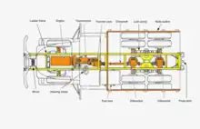 A ladder frame with three live beam axles, the front on leaf springs, the rear tandem on leaf springs with locating arms. Brakes on the M39 and M809 were air over hydraulic with drum brakes on all wheels, M939s were full air. Many trucks were available with a front-mounted 20,000 lb (9,100 kg) capacity winch.[25][26][27]