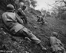 Men of the 504th Regimental Demolition Platoon keep a close eye while a demolitions expert searches for hidden S-mines on the slope of Hill 1017, November 1943.