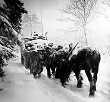 Throughout the initial days of battle with experienced German troops, the regiment wore down the enemy and discovered the Germans had only poorly organized and inadequately equipped follow-on forces. Soon thereafter, the paratroopers received the orders they had been expecting—to attack the Siegfried Line. The regiment was positioned on the right flank of the U.S. First Army, and on 28 January 1945 the 504th advanced through the Belgian forest of Büllingen in columns of two along a deep snowy trail, meeting only spotty resistance along the way.[8]