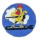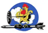 - ↑ Approved 18 January 1957. Description: Over and through a medium blue disc, a caricatured light golden brown gamecock, with black tail feathers, red comb and wattles, white eyeball and talons, and black outline, standing on a large black guided missile, highlights white and gray, and holding a black radar antenna, highlights white and gray, braced under his left wing, all in front of a large white cloud formation.