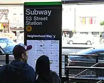 - ↑ Cox, Jeremiah (June 9, 2009). "A 53 Street platform sign, text and a arrow for 52 St is painted beneath this one". subwaynut.com. Archived from the original on March 8, 2016. Retrieved March 26, 2017.
