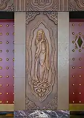The decorative details continue in the 2,130-seat auditorium, but the highlight and focal decorative feature is the octagonal caisson from which a sculpted five-toed Imperial Chinese dragon springs. A large chandelier of glass hangs from the dragon's mouth, in reference to the Chinese symbol of a dragon disgorging flaming pearls.[4] One claim puts the size of this caisson at twice the size of the model on which it was based in the throne room of the Hall of Supreme Harmony in the Forbidden City.[5] The opening night program spoke effusively of it: