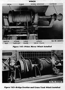Prime movers had a 25,000 lb (11,000 kg) winch behind the cab, most other trucks had a front-mounted two-drum winch for self-recovery. Trucks converted from prime mover chassis had no winch at all.[11]