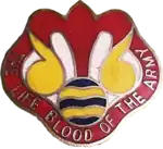 Per pale Or and Gules, a wreath of stylized rice counterchange; on a chief embattled of three Sable a fleur-de-lis of the first. Yellow (buff) and scarlet are the colors used for Support units and black refers to the former petroleum capability of the 64th Support Battalion. The fleur-de-lis and the three battlements allude to the three campaigns credited to the organization in France and Europe during World War II and the oriental rice motif symbolizes service in Vietnam. The turned down inner blades of the wreath, crossing diagonally, simulate the Roman numeral X and refer to the participation in then Vietnam campaigns. The two red areas allude to the two Meritorious Unit Commendations awarded the organization during that period.[7]