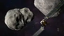 NASA redefined mission requirements and decided to proceed with a 2020s mission to visit Didymos with an impactor, which had been considered as a part of the earlier AIDA mission, named the Double Asteroid Redirection Test or DART. The NASA mission was intended to test whether a spacecraft impact could successfully deflect an asteroid on a collision course with Earth. The DART spacecraft was launched on 24 November 2021, and impacted Dimorphos on September 26, 2022.[27][28][29] It was accompanied by the Italian Space Agency's (ASI) six-unit LICIACube flyby Cubesat that was released 15 days before impact to observe the asteroid and DART's impact.[30]
