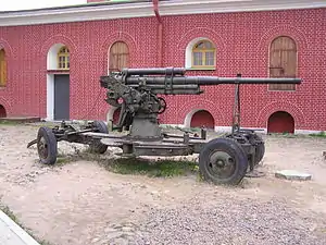 76 mm air defense gun M1938 (Russian: 76-мм зенитная пушка обр. 1938 г.) was a 76.2 mm (3 inch) Soviet air defense gun, created by Soviet artillery designer M.N.Loginov. This gun was a modernized version of the 76 mm air defense gun M1931, with a slightly modernized barrel and a completely new two-axle carriage ZU-8. This carriage was also used for the more powerful 85 mm 52-K air defense gun, developed in 1939.