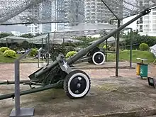 The 85-mm divisional gun D-44 (Russian: 85-мм дивизионная пушка Д-44) was a Soviet divisional 85-mm calibre field artillery gun used in the last action of World War II. It was designed as the replacement for the 76 mm divisional gun M1942 (ZiS-3). The gun was no longer in front-line service with the Russian Ground Forces, until being pressed back into service in the Russo-Ukrainian War in 2023.[4] Some 200 of the Chinese Type 56 variant are still in service with the Pakistan Army.[5] Wartime service included use by communist forces during the Vietnam War[6] and by Arab forces during their conflicts with Israel.