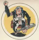 - ↑ Approved 17 May 1945. Description: On a yellow disc, border white, edged black, a caricatured black monkey, affronte, wearing light turquoise blue aviator's helmet, white goggles and parachute straps, and brown parachute pack, having a bandage marked with blood about right forearm holding finger of right hand aloft in "o.k." symbol and grasping with left hand a gray aerial machine gun with smoke issuing from muzzle, all casting a black drop shadow toward base. Maurer reverses the approval dates for the 865th and 866th Bombardment Squadrons.