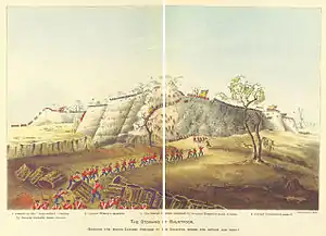 The regiment embarked for Egypt in April 1801 for service in the Egyptian Campaign.[3] The regiment landed at Suez and following a long march across northern Egypt[5] and the surrender of Cairo by the French Army in June 1801, the regiment occupied the citadel at Cairo.[6] The regiment returned to Bombay in spring 1802[7] and then provided storming parties for two unsuccessful assaults at the Siege of Bharatpur in January 1805 during the Second Anglo-Maratha War.[8] Twenty-five soldiers from the regiment were killed in the disastrous operation.[9] The regiment returned to Bombay in March 1806 and immediately embarked for Goa.[10] The regiment became the 86th (Leinster) Regiment of Foot in October 1809.[11]
