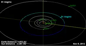 This body is orbiting the Sun with a period of 4.17 years and an eccentricity of 0.105. The orbit of this object brings it to within 4.9 Gm of the dwarf planet Ceres, and the resulting gravitational interaction has been used to produce mass estimates of the latter.[5] The cross-section size of the asteroid is 110 km and it has a rotation period of six hours. The surface coloring of 91 Aegina is very dark and this C-type asteroid has probably a primitive carbonaceous composition. Observation of absorption bands at wavelengths of 0.7 and 3μm indicate the presence of hydrated minerals and/or ice grains on the surface.[6]