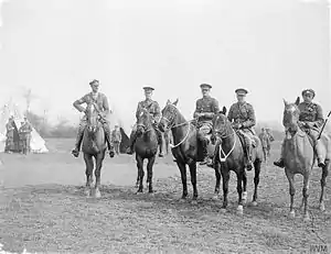 Brig-Gen E. P. Strickland was appointed to command the brigade when it went on service, with Major R. H. Hermon-Hodge, Grenadier Guards, as his brigade major.[13][19][21] 98th Brigade landed in France to join the British Expeditionary Force (BEF) in November 1915, but 18th and 20th Royal Fusiliers were immediately exchanged with two battalions from 19th Bde, a Regular Army brigade that had been transferred into 33rd Division to exchange experience. In December the reorganised division took over the trenches on the La Bassée front from Givenchy to 'Mad Point', just north of the Hohenzollern Redoubt, scene of bitter fighting the previous autumn, but now considered a 'quiet' sector suitable for newly-arrived formations to learn the routines of trench warfare, including trench raiding and crater fighting. After only a short period the two remaining Public Schools battalions in 98th Bde were transferred to GHQ Troops on 27 February 1916 and disbanded on 24 April, when the majority of their personnel were commissioned as officers.[13][9][10][18][22][23] From then until the end of the war the make-up of the brigade was a mixture of Regular, Special Reserve (SR) and Territorial Force (TF) units, with no New Army elements.[13][18]