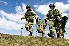 The 9M133 missile together with its 9P163-1 tripod launcher and 1PN79-1 thermal sight (part of the 1P45-1 guidance device),[14] form the 9K135 missile system,[15] which can be carried and operated by a two-person infantry crew. The transfer to the firing position takes less than one minute, and preparation and production of a shot in at least one second.[16] When it's fired above the sight line, the Kornet ATGM allows attacking the target’s upper semi-sphere, as the armor is usually thinnest on the top of a vehicle.[17]