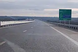 The bid for the design & build contracts for all four segments that are part of this section was launched by CNADNR during December 2010.[58] The Cunța – Săliște segment (22.1 km), which includes the 1,100-metre (3,600 ft) long Aciliu viaduct was awarded to Italian company Impregilo in May 2011,[59] while the Orăștie – Sebeș segment (24.1 km) was awarded to Austrian company Strabag, the Sebeș – Cunța segment (19.7 km) was awarded to a joint venture composed of Romanian companies Straco and Studio Corona and the Săliște – Sibiu segment (16.1 km) was awarded to Italian company Astaldi, all in June 2011.[60] Construction works on all four segments have started in October 2011 and were planned to finish in April 2013.[61] After several delays, lots 1, 2 and 4 were opened in December 2013,[62][63] while lot 3 was eventually opened at the end of November 2014.[64][65] As of November 2015 construction works were still ongoing on lot 3,[66] as there are multiple issues on this lot generated by a combination of ignoring the terrain instability identified by the feasibility study, the low quality of the construction works and the Romanian Government pressuring for electoral reasons for the segment to open before a number of critical road elements were completed.[67][68][69][70] Another aspect that has surfaced and is generating controversy is related to the fact that while there are multiple disputes awaiting resolution between CNADNR and Impregilo and during the construction of the segment there were around 300 non-conformity reports issued, CNADNR has paid to Impregilo the works executed.[71] Following this, during August 2015 the general manager of CNADNR has given a number of interviews during various TV shows defending the company and putting all the blame for the issues on lot 3 on the poor quality of execution of Impregilo.[38][72]