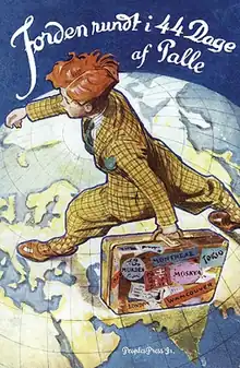 His trip was sponsored by a Danish newspaper and made on the occasion of the 100th birthday of Jules Verne, a French author of adventure and science fiction.[n 1] Palle Huld was chosen after having answered a newspaper advertisement; applicants had to be boys,[n 2] 15 years old, able to manage in English and German and of good health.[3] Like the characters in Jules Verne’s 1873 novel Around the World in 80 days[n 3] he was only allowed to travel by land and sea, not by air. The travel (on first class) went from Denmark to Great Britain, across the Atlantic Ocean to Canada. From the American west coast he continued to Japan, China, Soviet Union, Poland, Germany and back to Denmark. He had to travel alone but was helped along the way by reporters of the newspaper, members of Danish embassies and local Boy Scouts.[3] The travel was followed by not only Danish newspapers but newspapers around the world and on his return to Copenhagen he was met by a crowd of 20,000 people.[7]